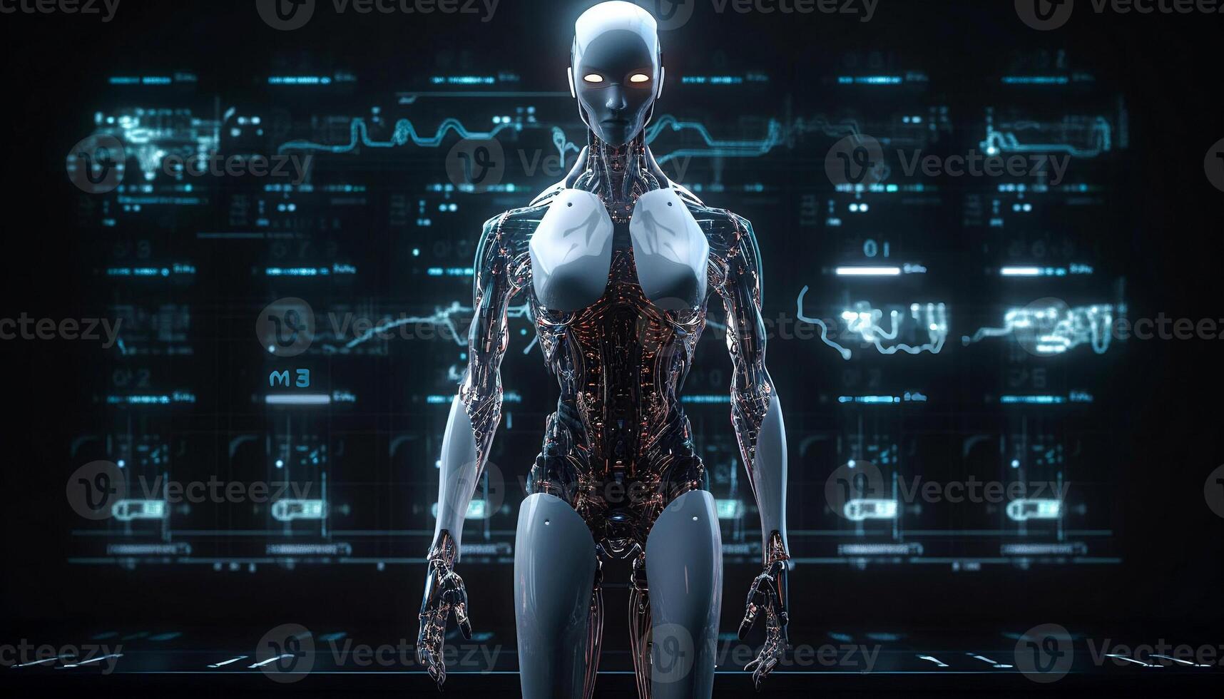 An AI human robot standing in front of a massive data wave. and information technology Pro Photo