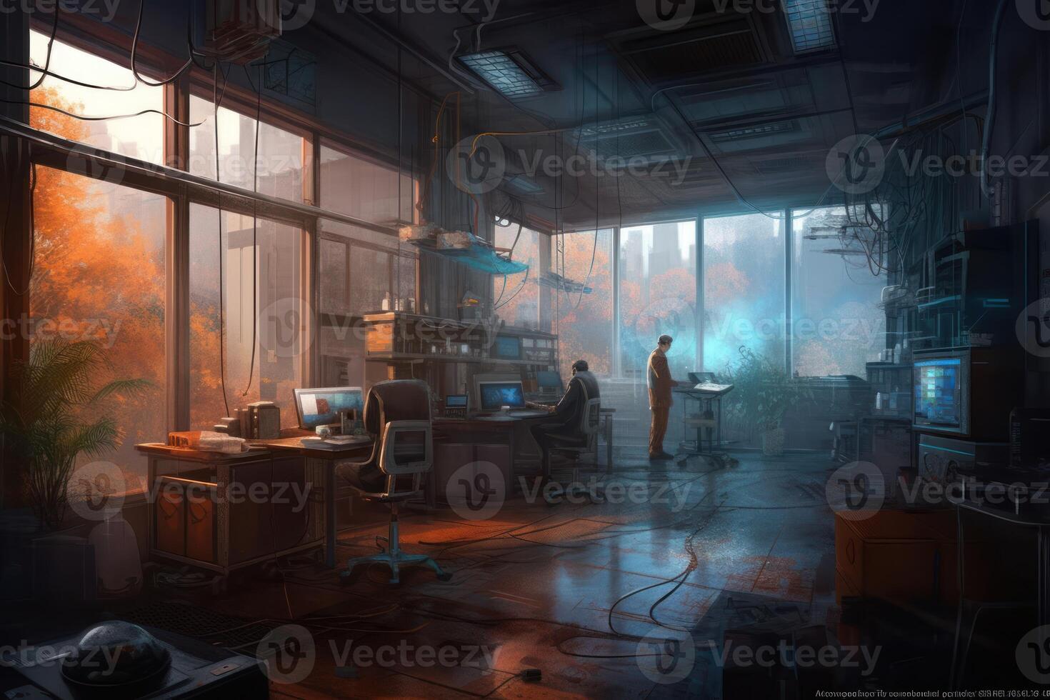 Man working diligently on a computer within a modern office setting, . Pro Photo