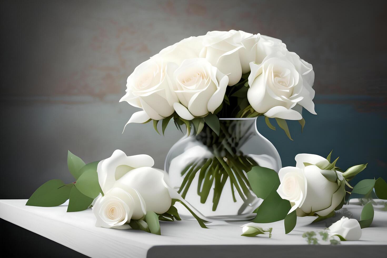 A vase of white roses sits on a table with a grey background. photo