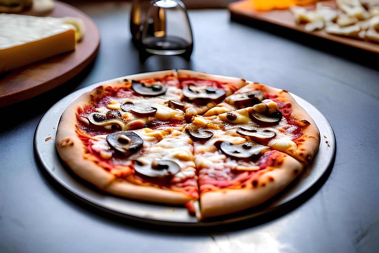 A pizza with mushrooms on it and cheese on the side. Free Photo