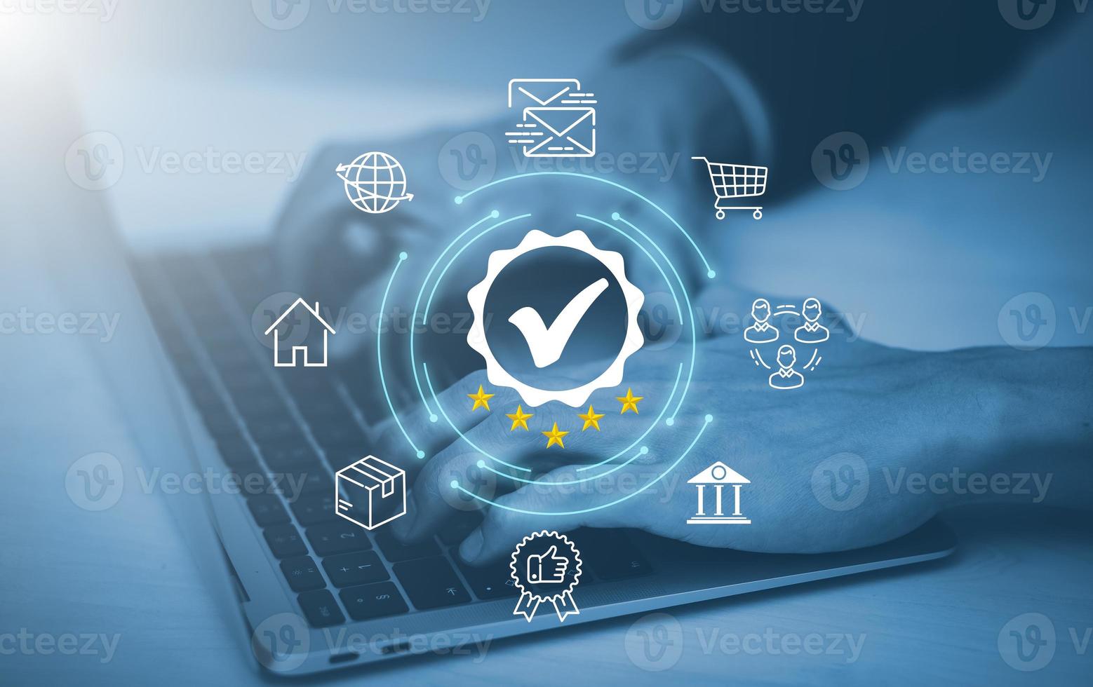 Hand-using tablet with Quality management with Quality Assurance or QA and Quality Control or QC and improvement. Standardization and certification concept. Compliance with regulations and standards. Pro Photo