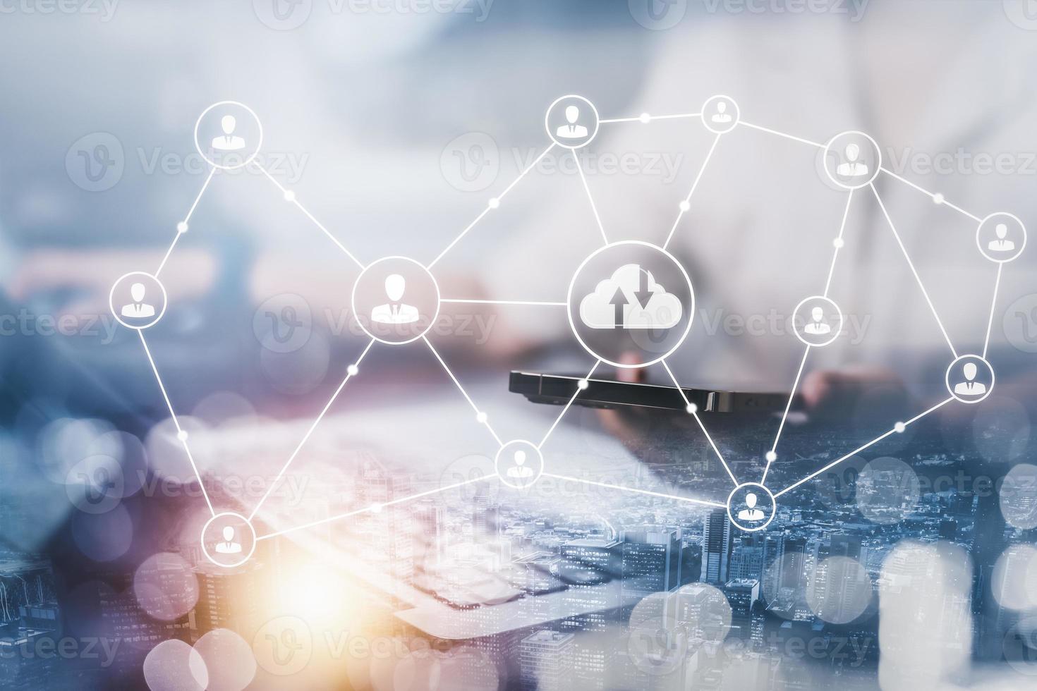 Business people holding smartphones and laptops with cloud computing diagrams shown on hand. Cloud technology. Data storage. Networking and internet service concept, Cloud sharing download and upload Pro Photo