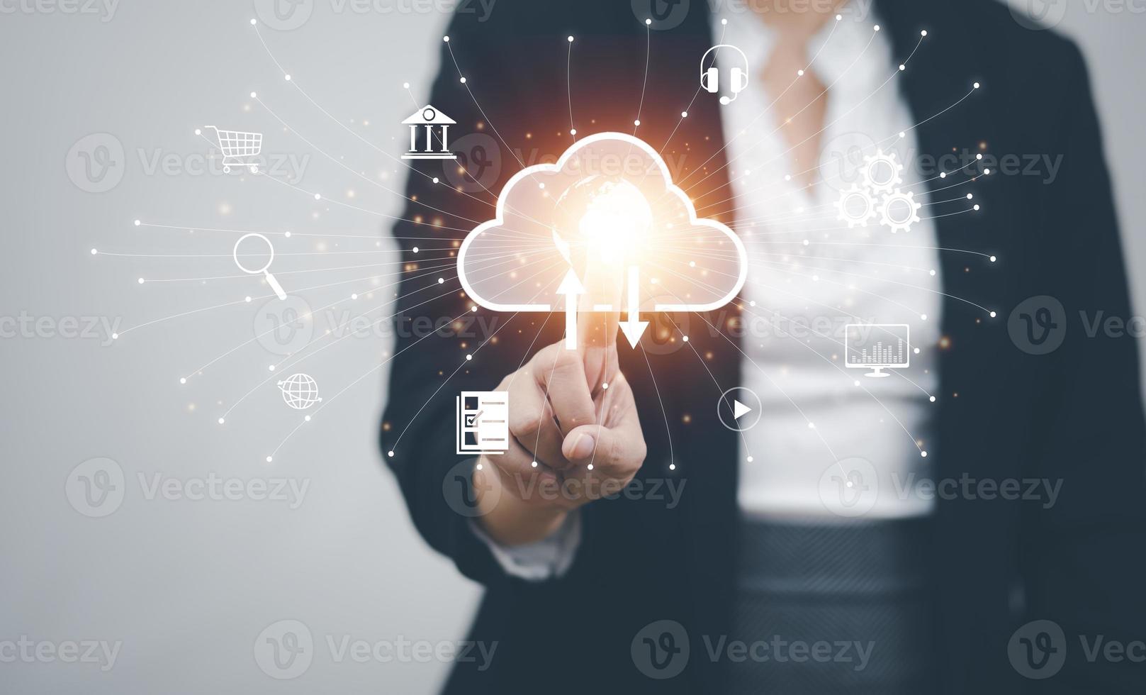 Woman touch line connect to data information on the Cloud Computing Technology Internet Storage Network Concept And a large database big data Through internet technology, Cloud sharing download Pro Photo
