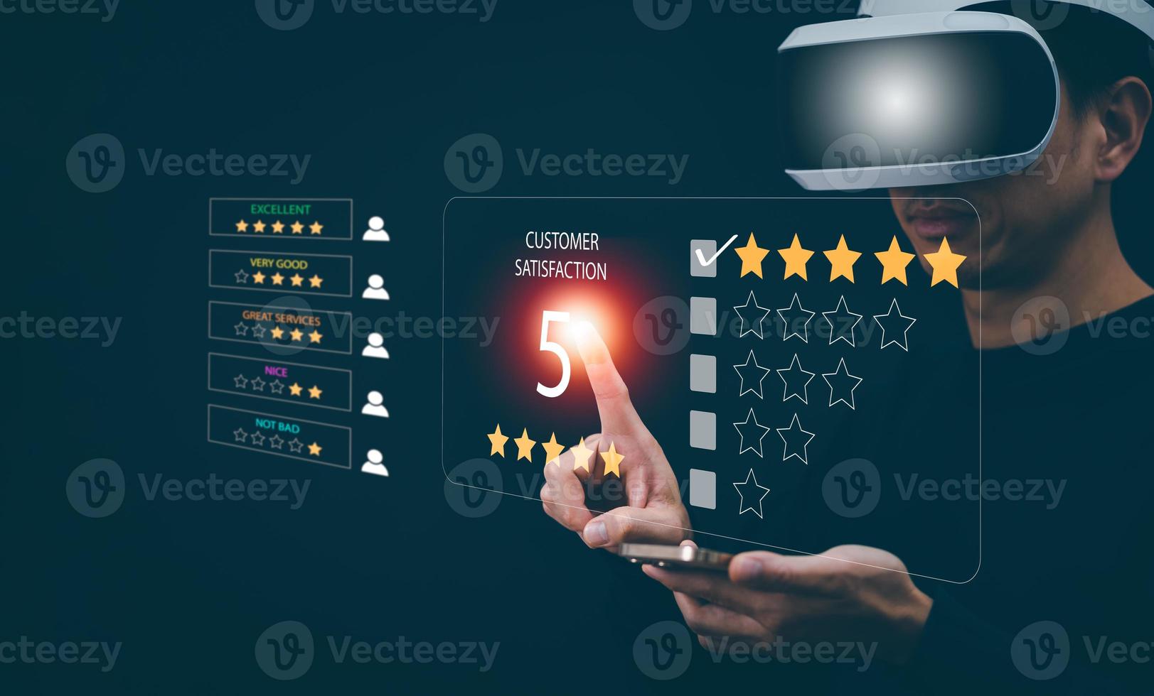 Man wearing VR glasses virtual touch Customer review satisfaction feedback survey concept, User give rating to service experience on online application, service leading to reputation ranking business. Pro Photo