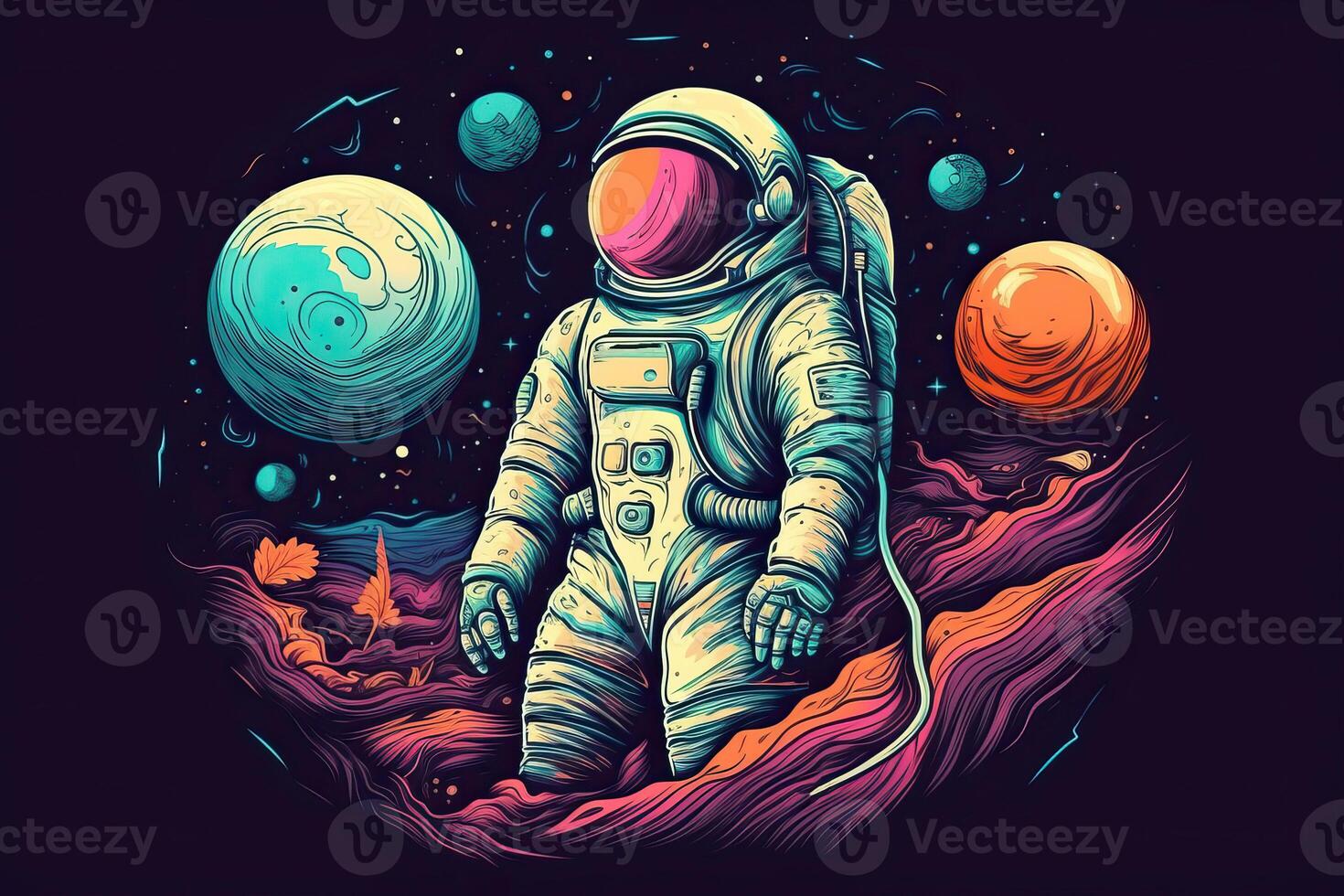 An astronaut in a spacesuit flies in space between the planets. Pro Photo