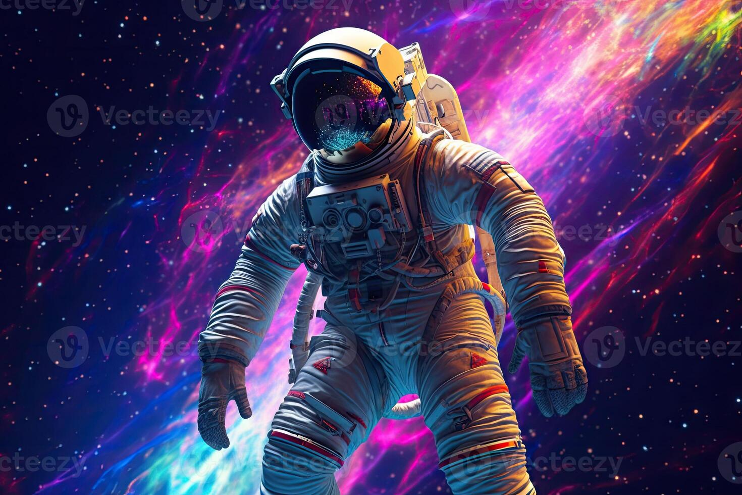 Astronaut do spacewalk in outer space . Spaceman float in space. Bright background. Pro Photo