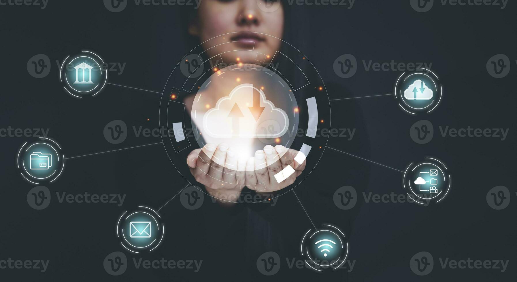 Business woman touching connect to data information on cloud computing network. Cloud computing concept.Cloud computing and network security, Cloud sharing download and upload big data information. Pro Photo