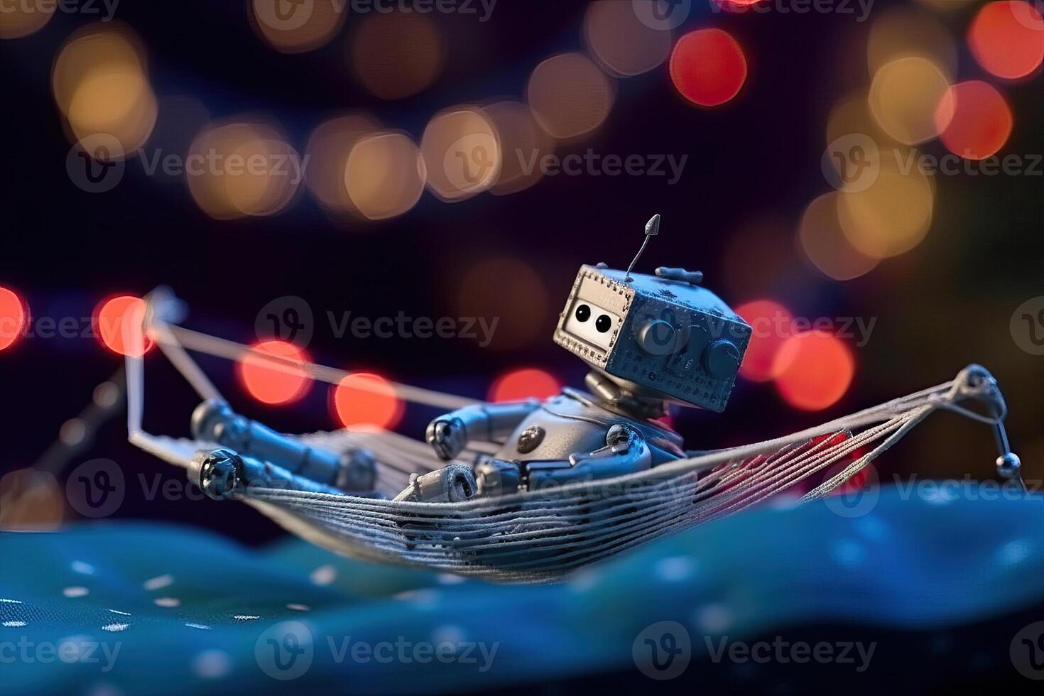 An old-fashioned robot swings in a hammock against the backdrop of bright holiday lights, . Pro Photo