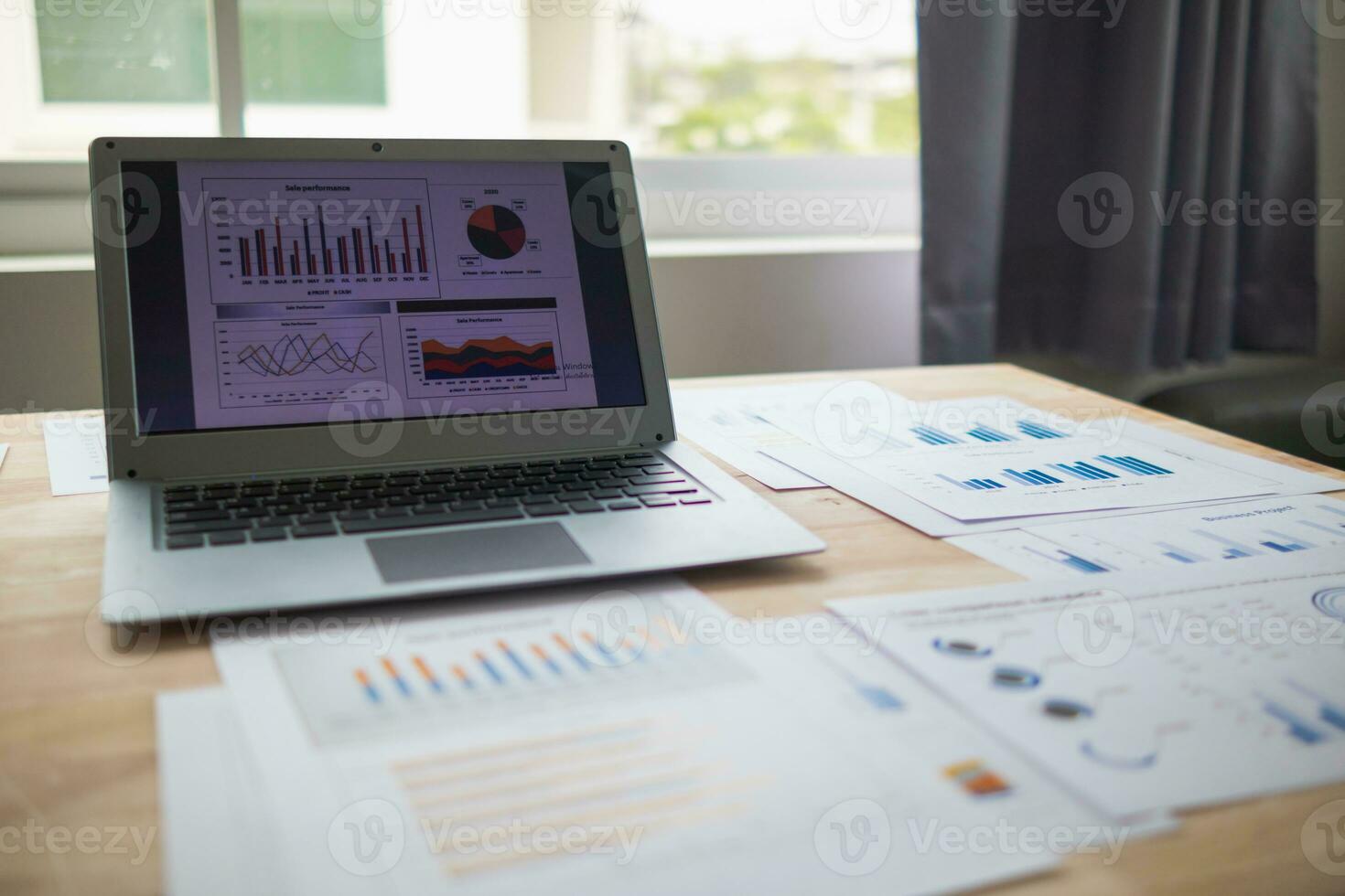 laptop and bunch of papers on desks in conference room are prepared for business performance meetings and turnover summaries to improve in future.Concepts of Preparing Business Results Documentation Pro Photo