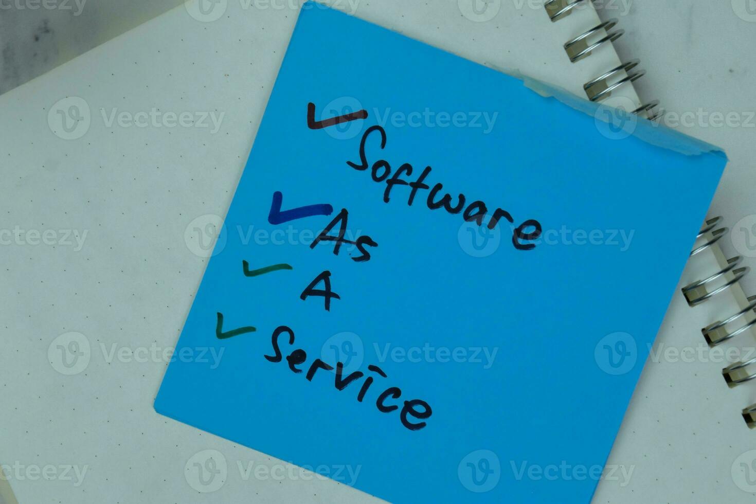 Software As A Service write on sticky notes isolated on Wooden Table. Pro Photo
