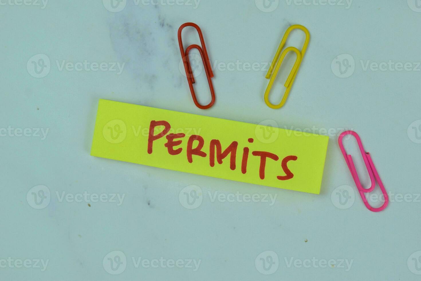 Concept of Permits write on sticky notes isolated on Wooden Table. Pro Photo