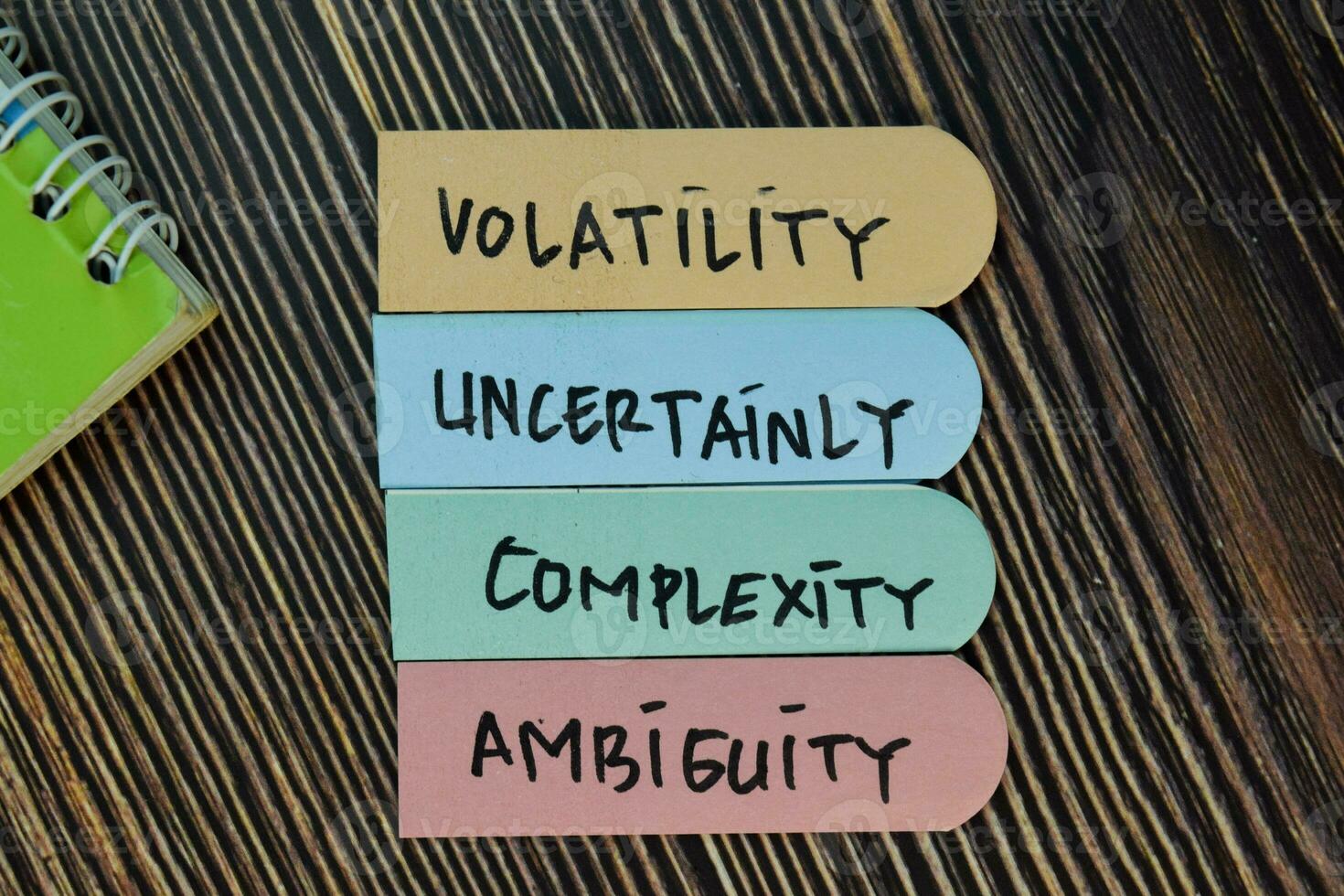 Volatility Uncertainly Complexity Ambiguity - VUCA text on sticky notes isolated on office desk Pro Photo
