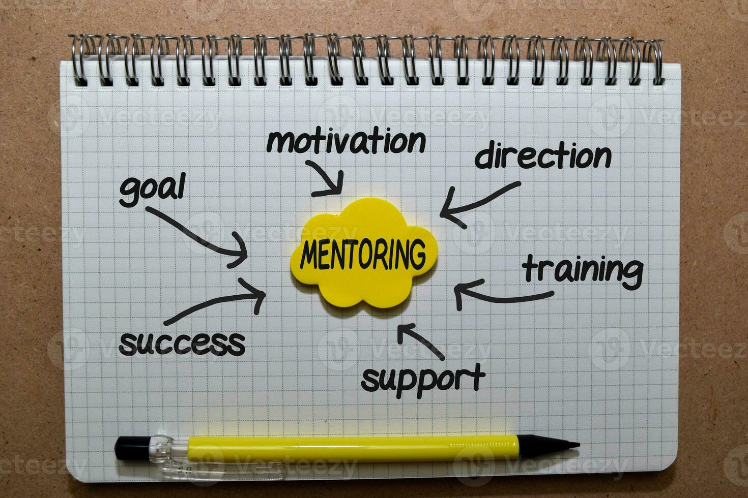 Mentoring on sticky note with keywords isolated on wooden background. Chart or mechanism concept. Pro Photo