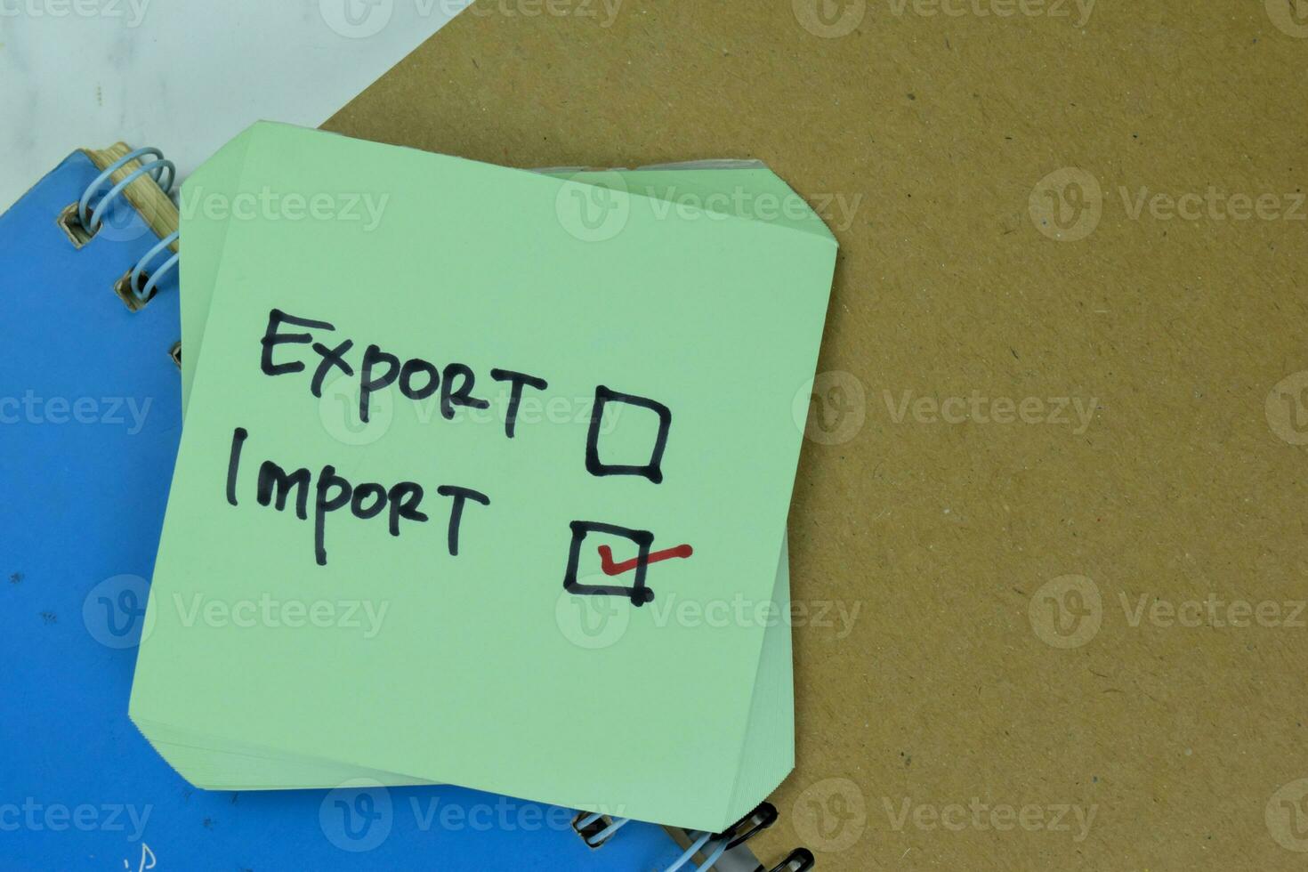 Concept of Export or Import He choose Import write on sticky notes isolated on Wooden Table. Pro Photo