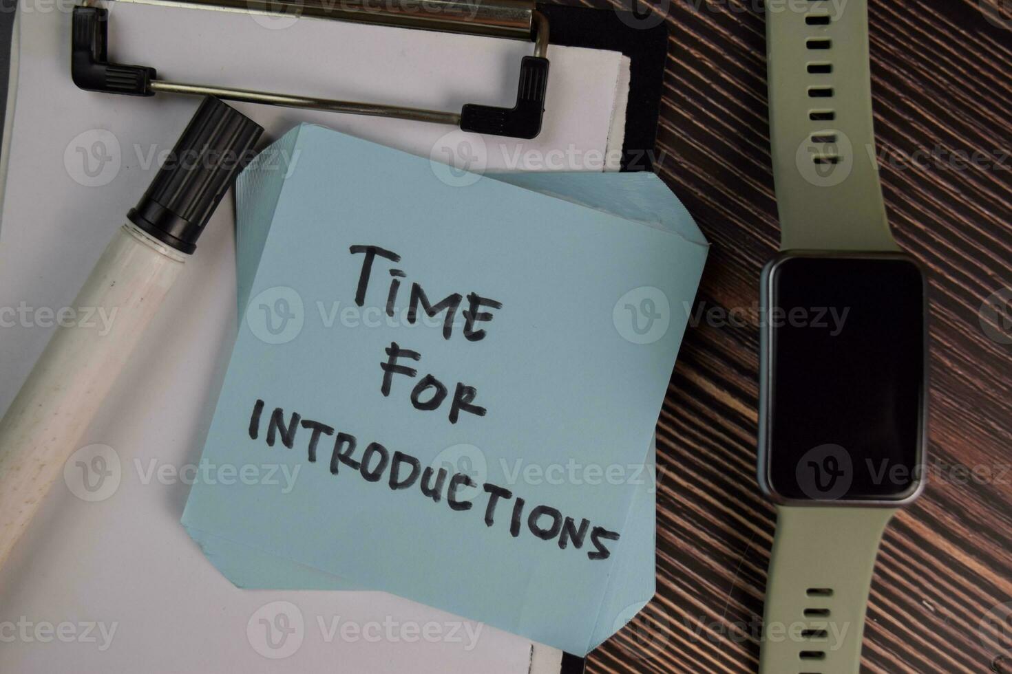 Time for Introductions write on sticky notes isolated on Wooden Table. Pro Photo