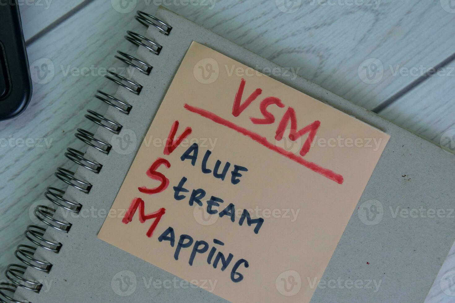 VSM - Value Stream Mapping write on sticky notes isolated on Wooden Table. Pro Photo
