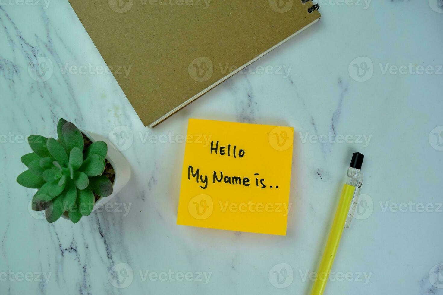 Concept of Hello My Name Is write on sticky notes isolated on Wooden Table. Pro Photo