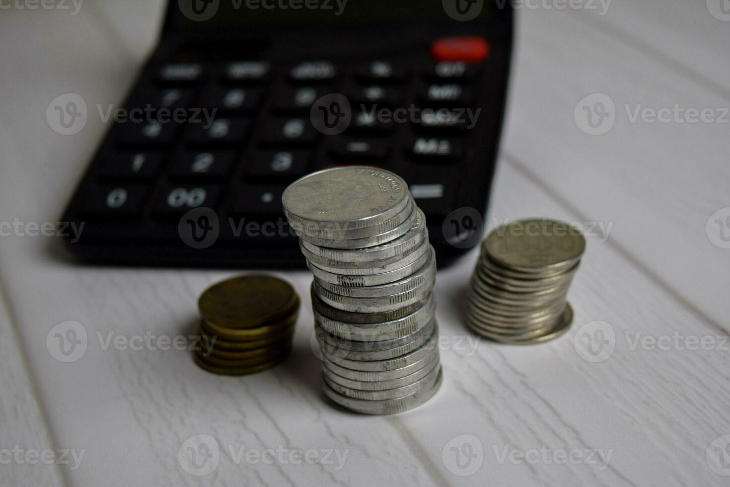 Calculator and the stack of coint isolated on office desk. calculating salary or tax concept Pro Photo
