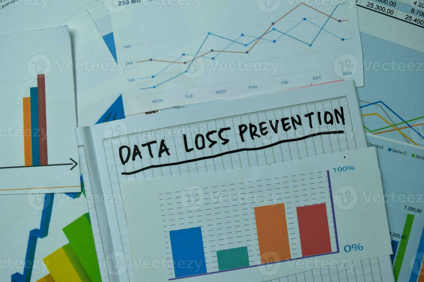 Data Loss Prevention write on sticky notes with graphs and diagram isolated on office desk. Pro Photo