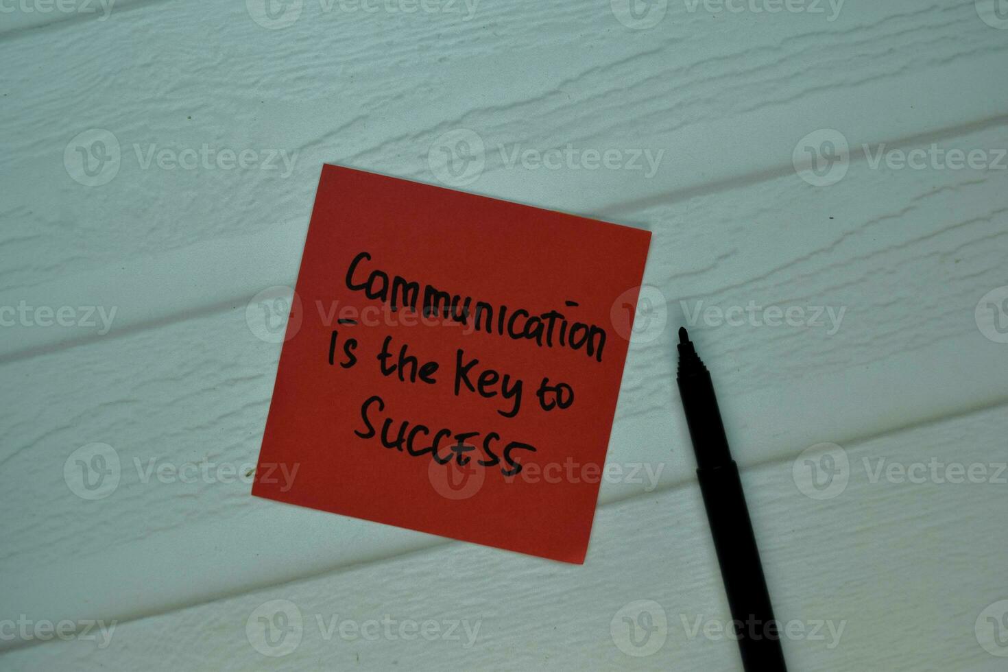 Communication is the key to success write on sticky note isolated on Wooden Table. Selective focus on Communication is the key to success text Pro Photo