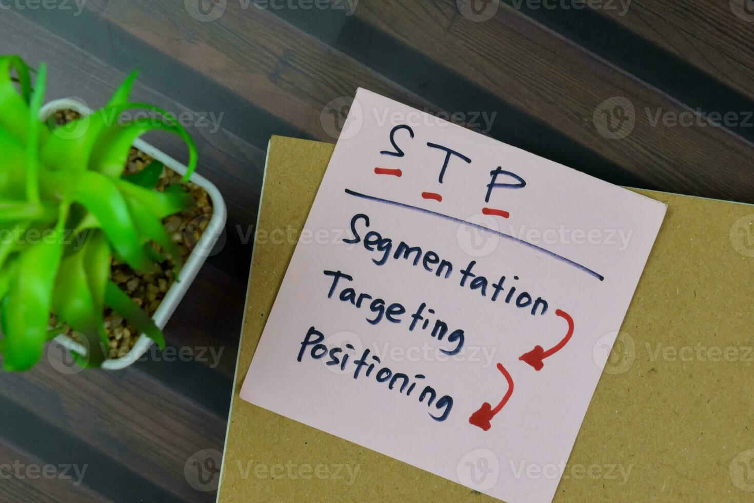 Concept of STP - Segmentation Targeting Positioning write on sticky notes isolated on Wooden Table. Pro Photo