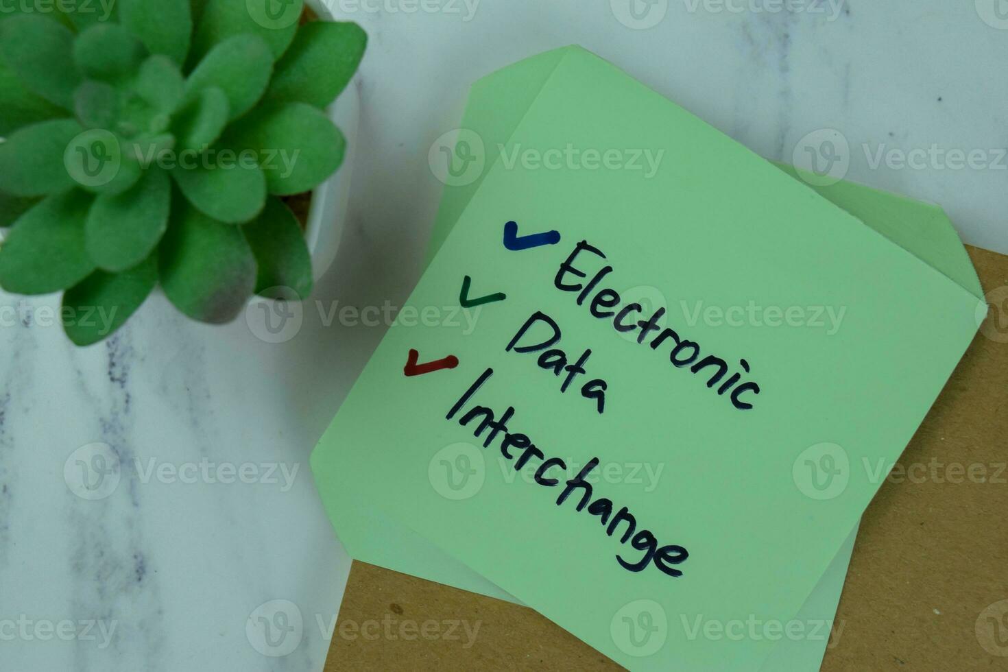 Electronic Data Interchange write on sticky notes isolated on Wooden Table. Pro Photo