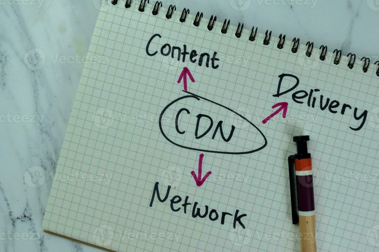 Concept of CDR - Content Delivery Network write on a book with statistics isolated on Wooden Table. Pro Photo