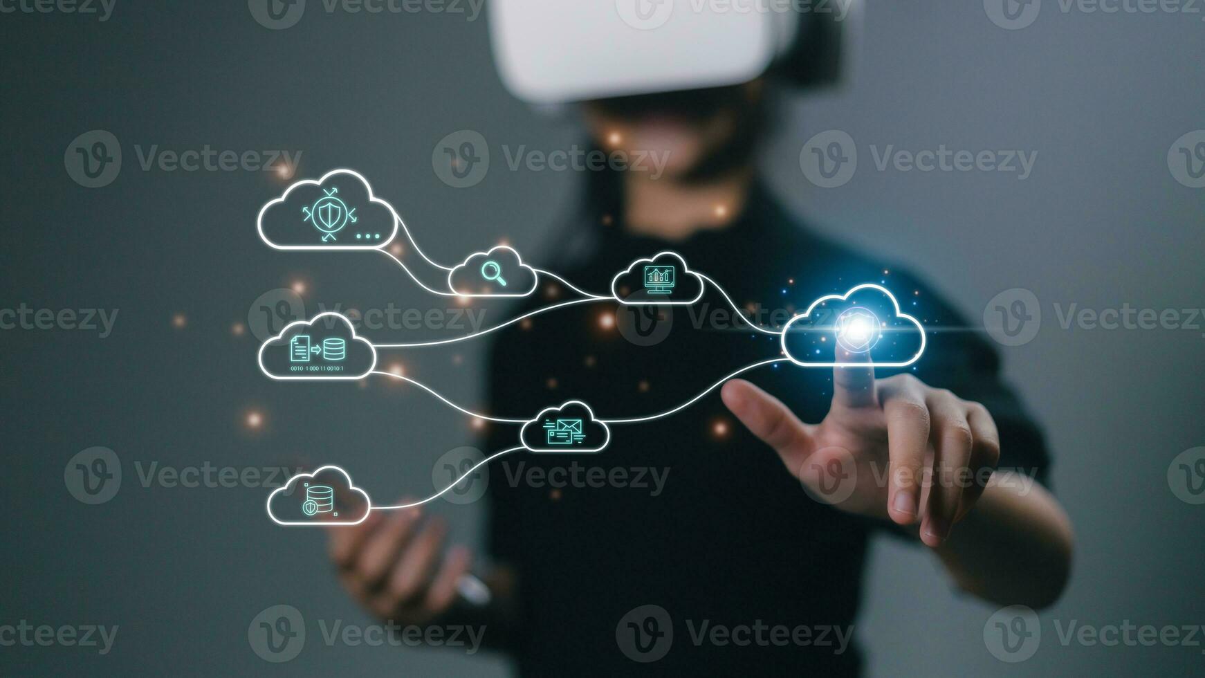 Women wear VR glasses and access Cloud Technology Internet Network data systems and databases through technology. Cloud computing concept Pro Photo