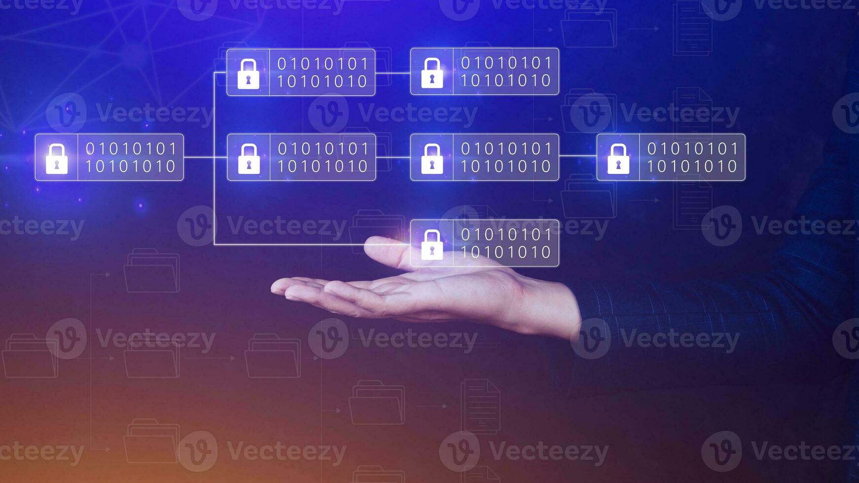 Businessman using a touching on virtual screen to Blockchain technology concept with chain of encrypted blocks to secure cryptocurrencies and bitcoin for online payments and money transaction. Pro Photo