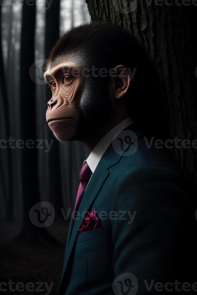 Monkey in the form of a man in a suit and tie with purple-blue fur on a black background, character portrait, photorealism. , generative, AI Pro Photo