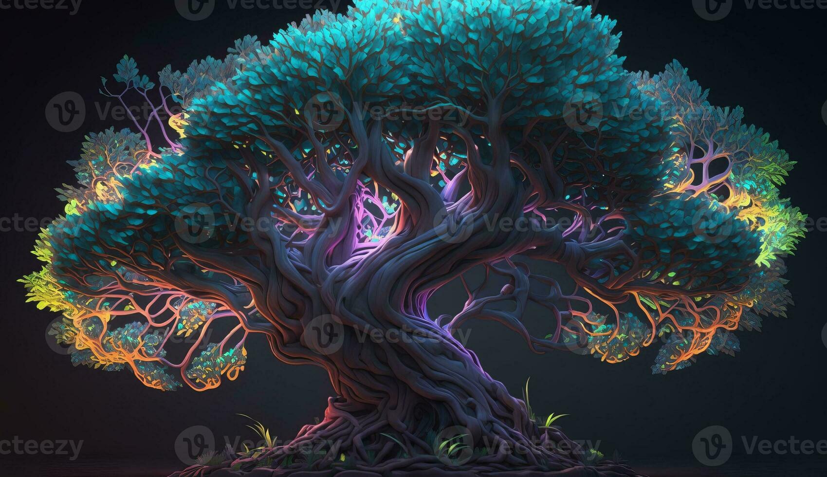 Luminous neon bonsai with a unique shape that goes beyond the monitor. ai generation Pro Photo