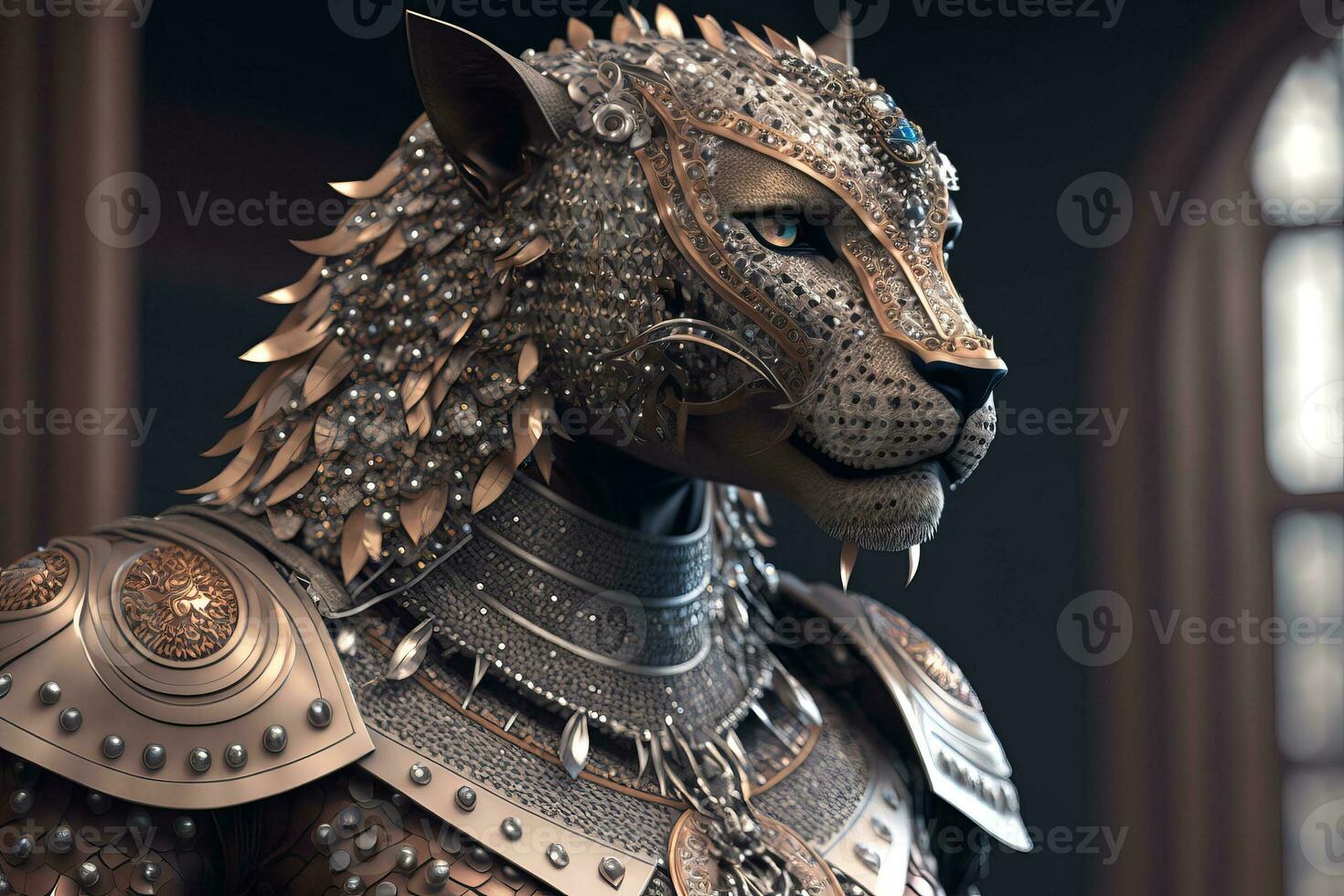 A fighting cheetah in a diamond helmet and beautiful armor stands and looks into the distance on a dark background with a window. ai generation Pro Photo