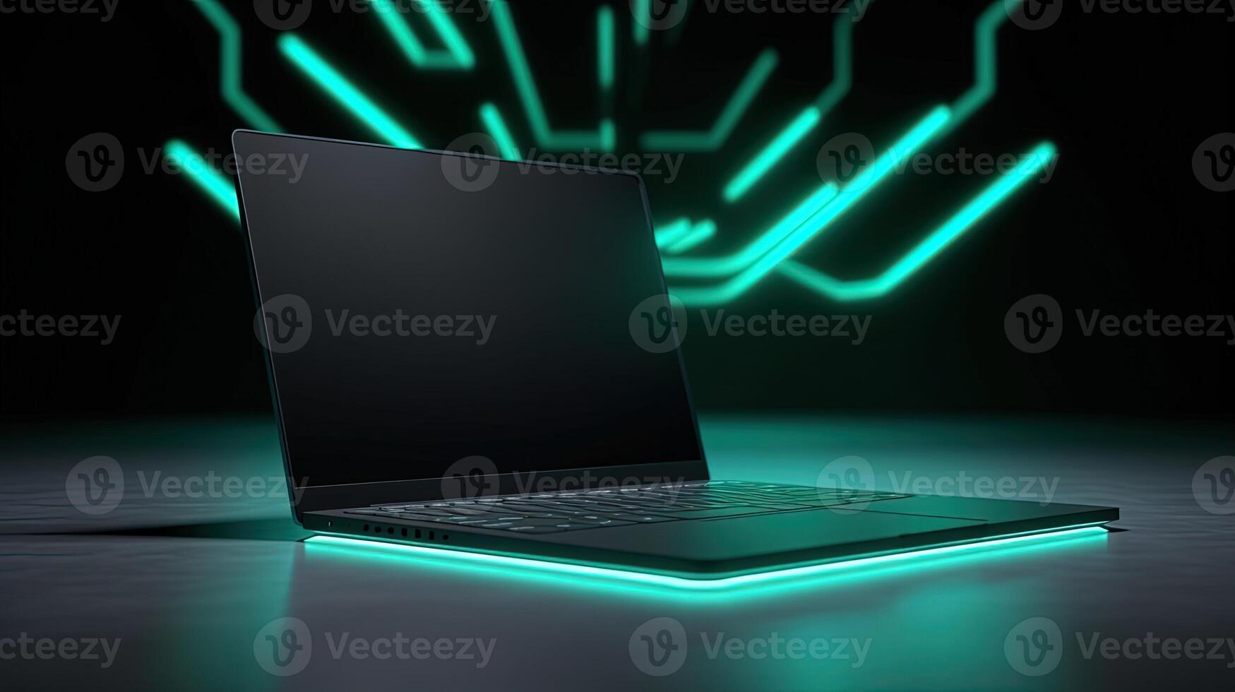 Black Notebook Computer or Laptop and Green Glowing Abstract Neon in Background, Created By Technology. Pro Photo