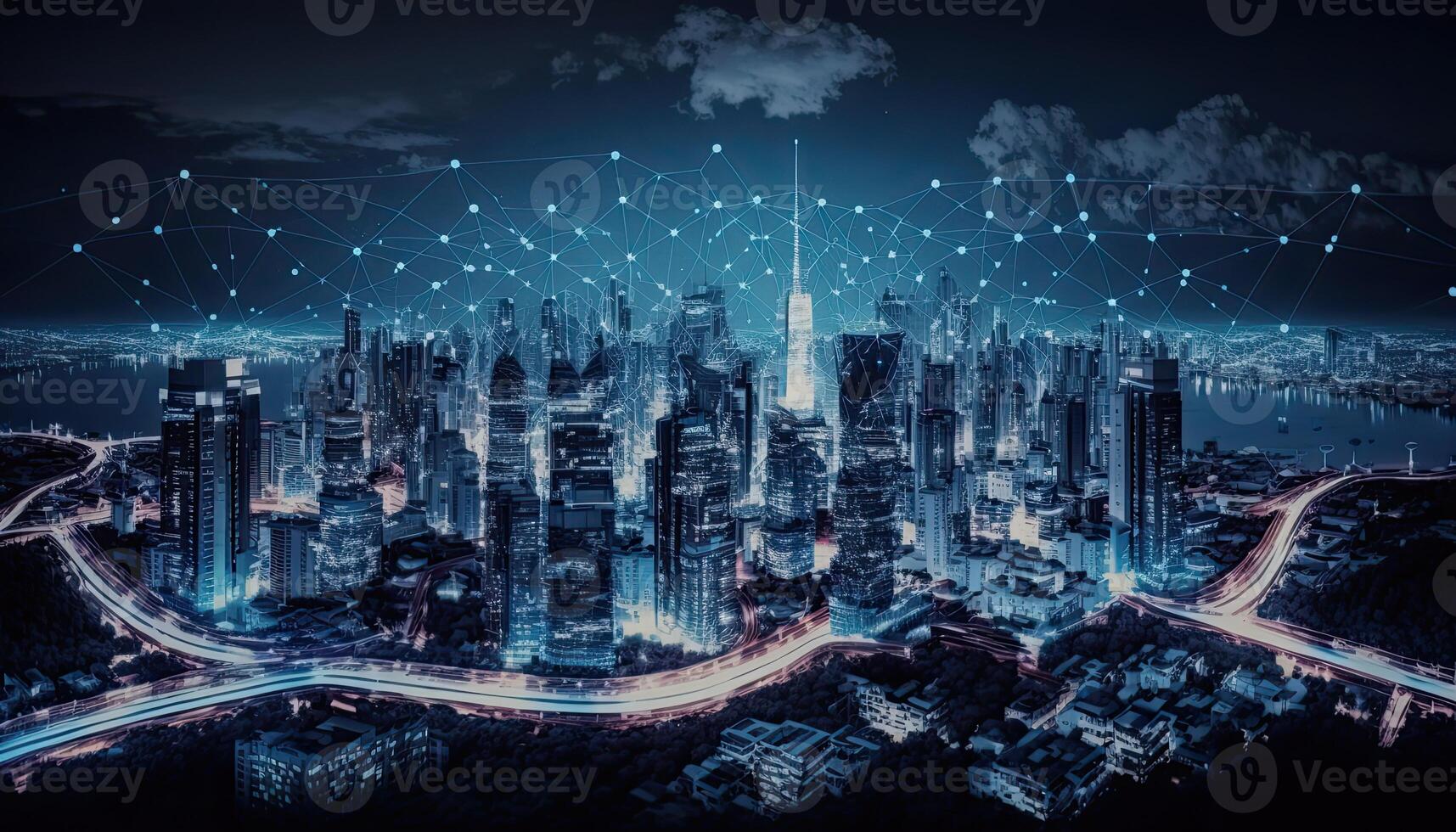 Panorama Aerial View of Smart City and Abstract Dot Point Connecting With Gradient Polygon Lines. Digital Illustration Pro Photo