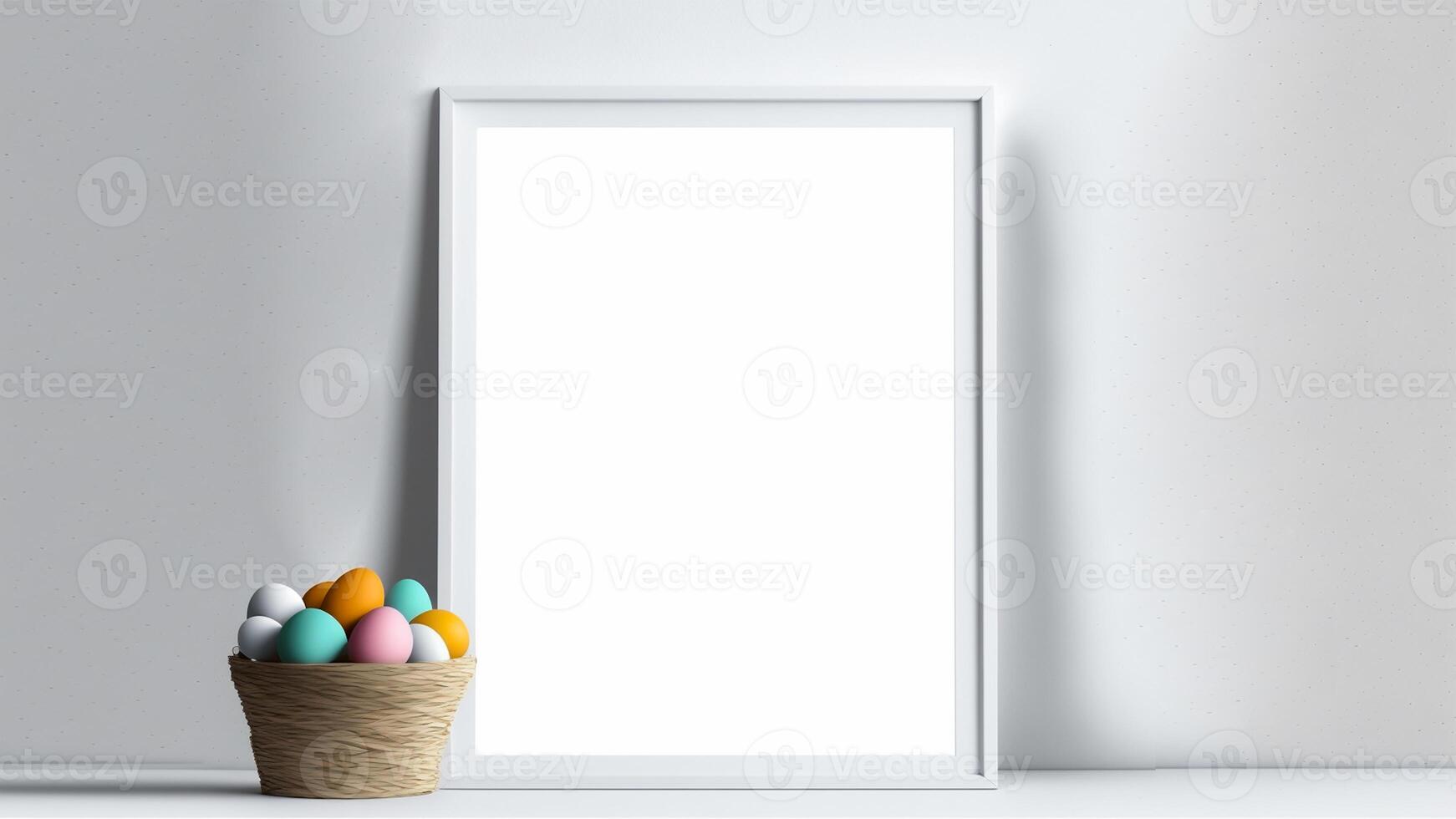 3D Render of Colorful Egg Basket, Empty Vertical Frame Against Grey Background And Copy Space. Pro Photo