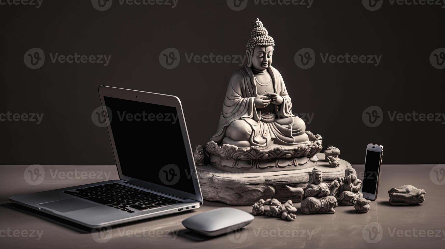 Digital Laptop with Magic Mouse, Smartphone and Statue of Buddha on Dark Background, Technology. Pro Photo