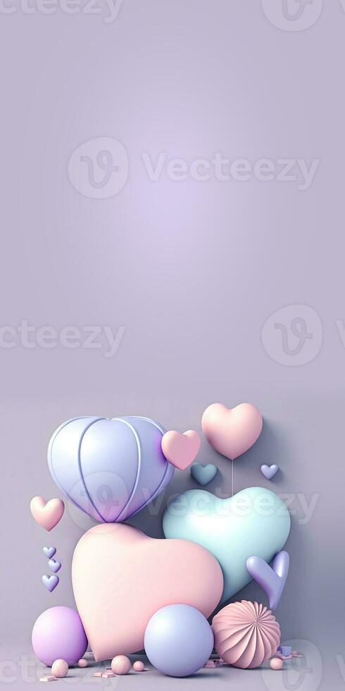 3D Render, Clay Modeling of Glossy Heart Shape Balloons And Abstract Object. Pro Photo