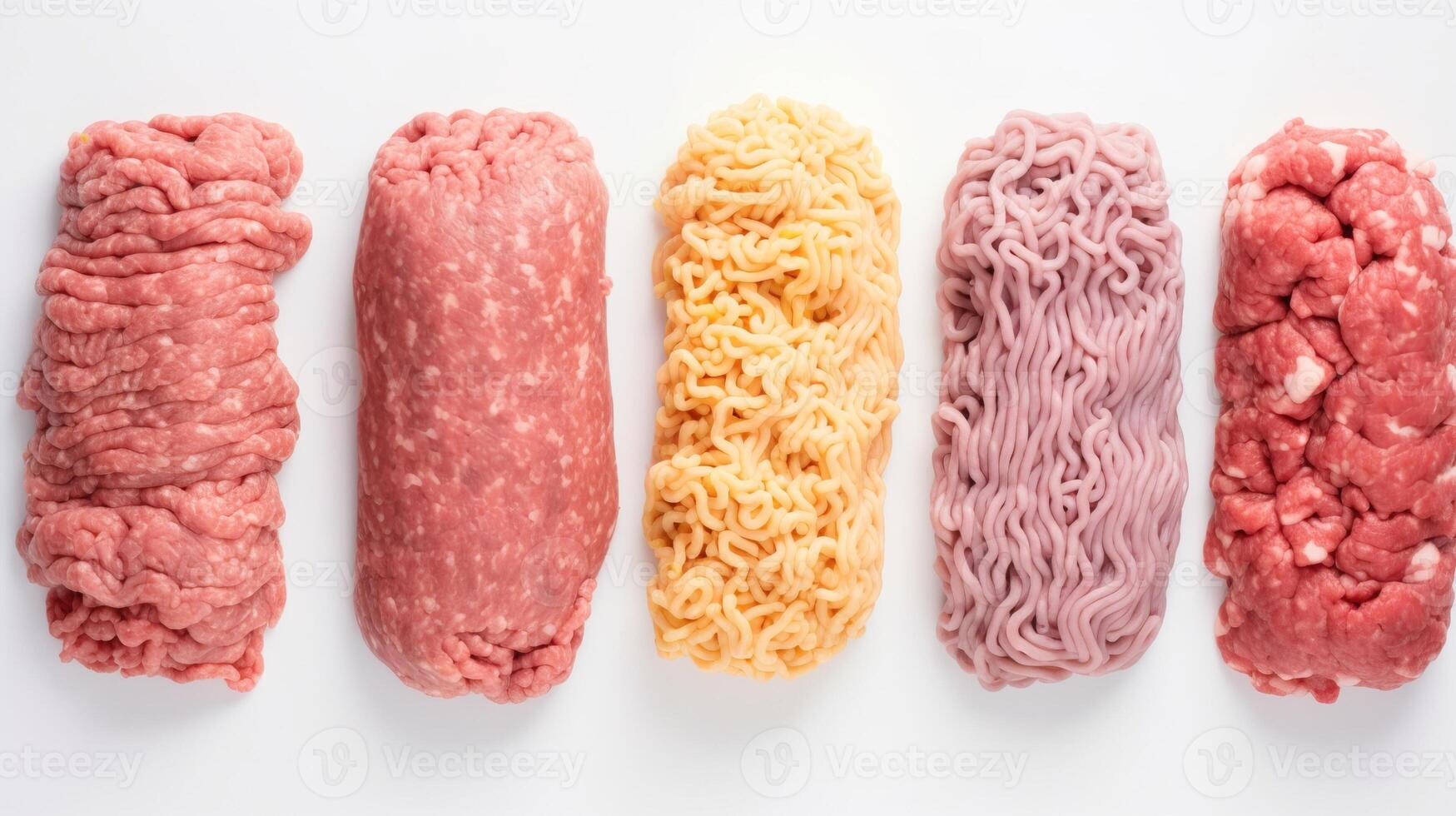 Various minced meat in a row, culinary ingredient, white background isolate. . Pro Photo