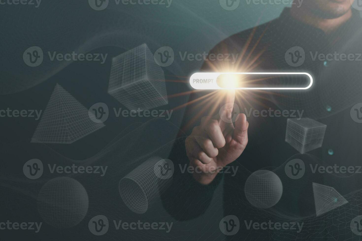 Businessman touching text box with 3D hologram sphere cylinder triangle cube shape, artificial intelligence concept. Chatbot generate image. Pro Photo