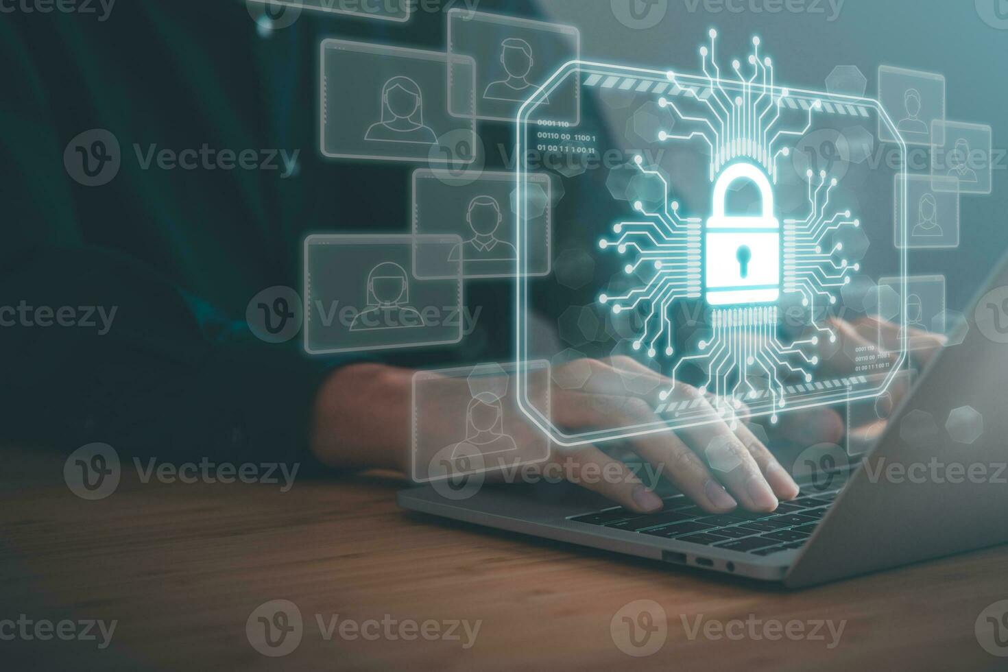 Data Security system concept, Business man use laptop with security icon screen, innovation technology, cloud computing, internet network communication Pro Photo