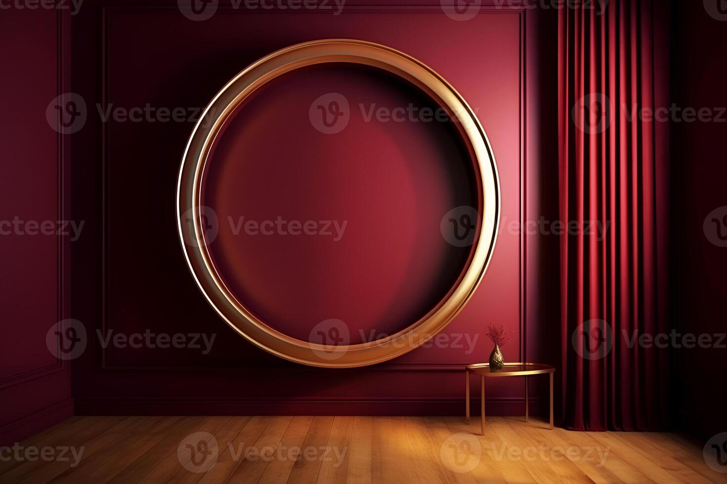 content, mockup, round golden frame with empty center inside in red minimalist interior. copy paste template Pro Photo