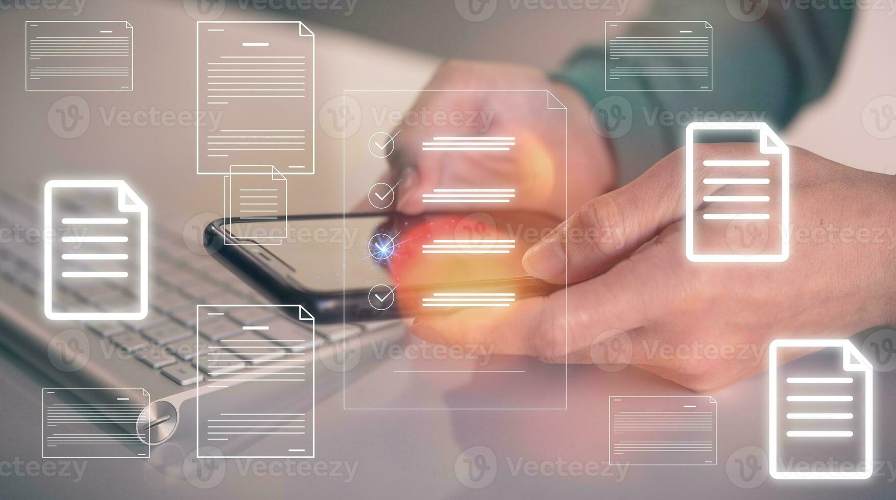 Document data system Report HR technology Concept, Businessman Manager typing on smartphone checking white documents reports papers of files icon in modern office, paperless documents Pro Photo