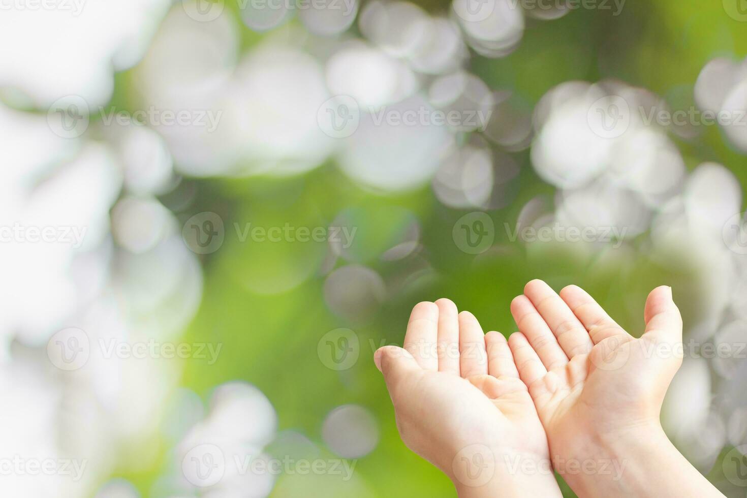 Closeup of child open two empty hands with palms up for pray to God and blessing on green blur background Pro Photo