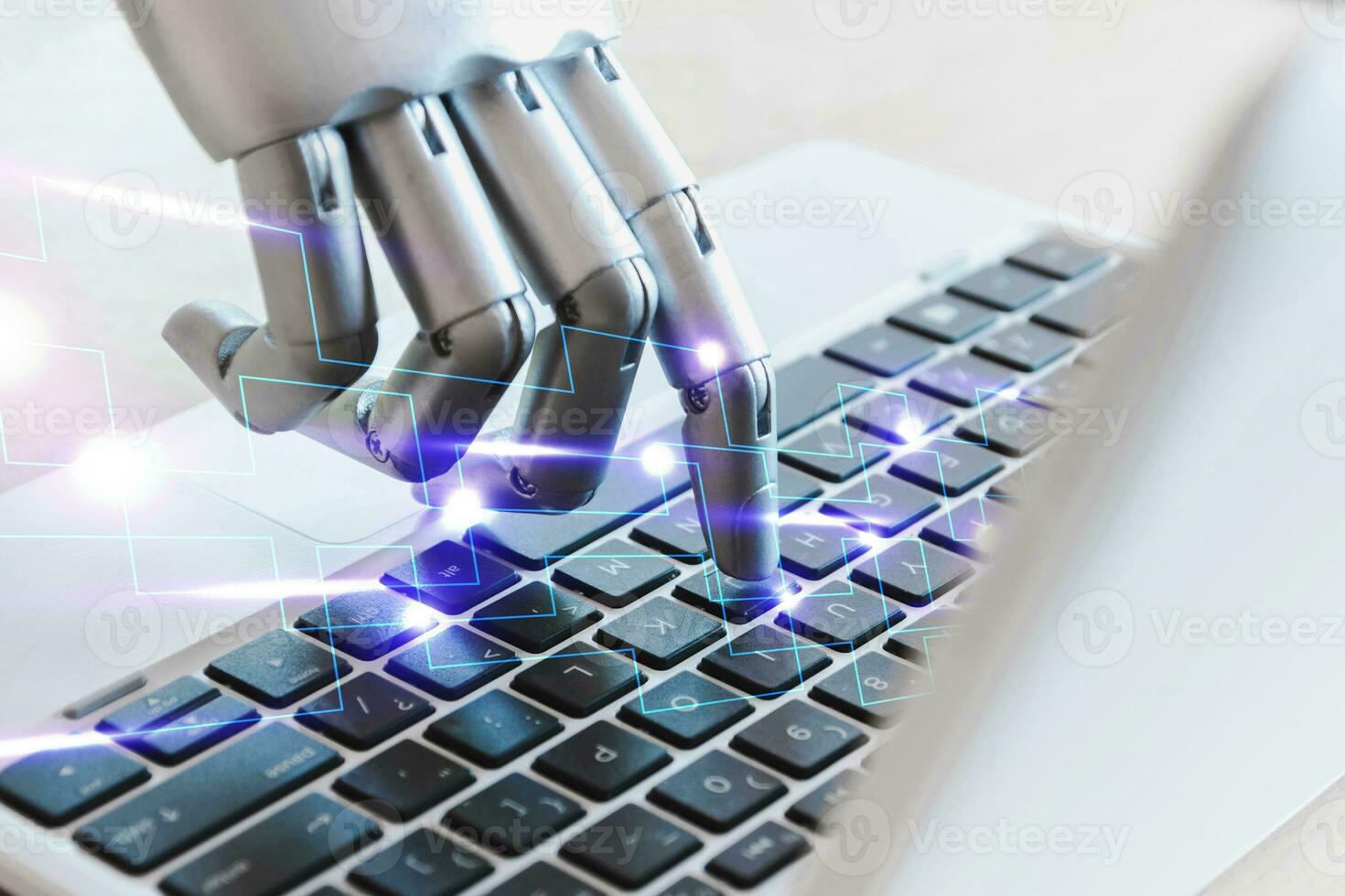 Innovation technology robot hands and fingers point to laptop button advisor chatbot robotic artificial intelligence concept Pro Photo