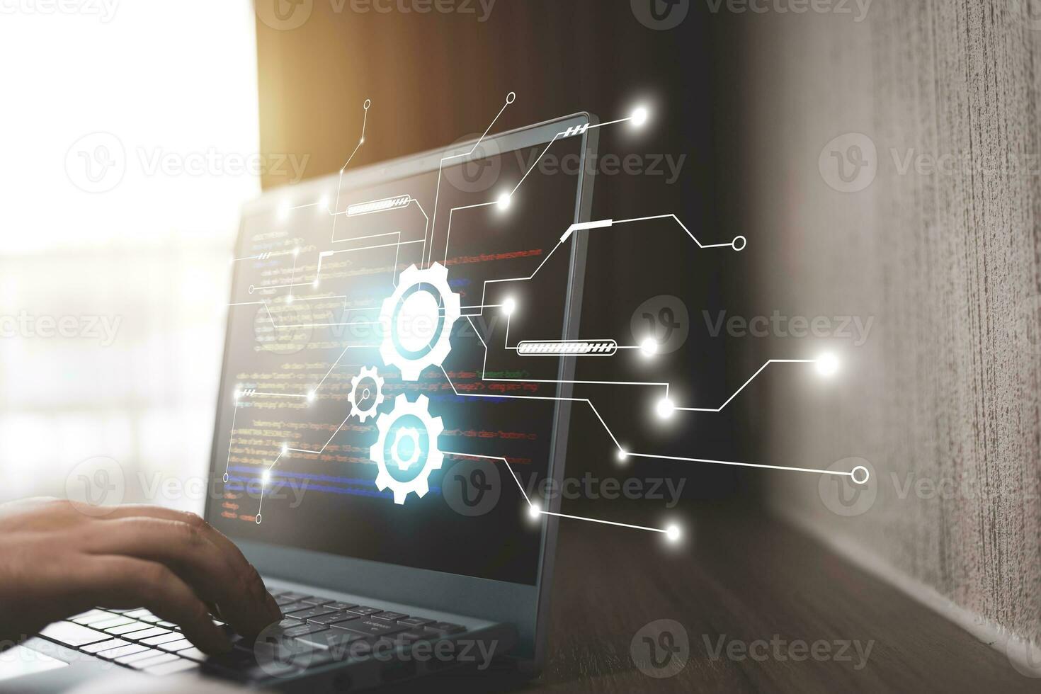 Programmer engineers write programs to develop systems Software of computer equipment. concepts of technology and modern business, coding, and networking online. Pro Photo