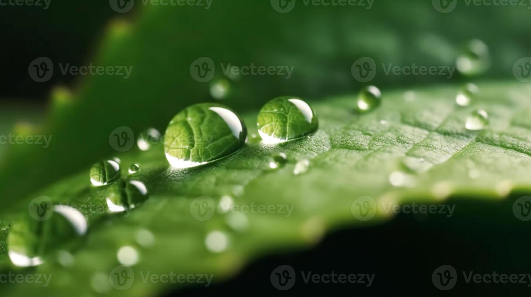 A green leaf with water droplets surface, with a dark green background. Pro Photo