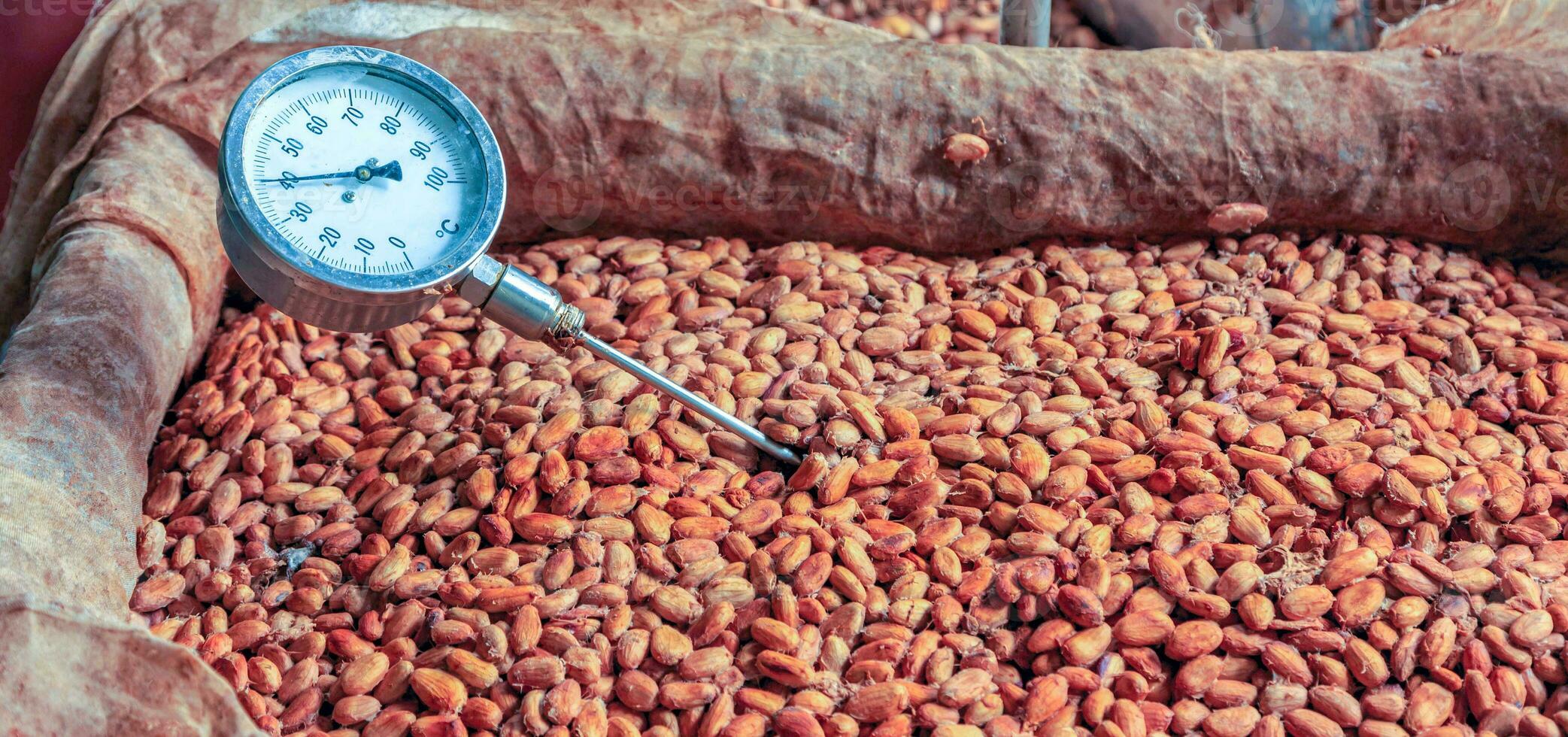 Workers use to measure the temperature of the fermented cocoa beans, fermenting fresh cocoa seeds to make chocolate. Pro Photo