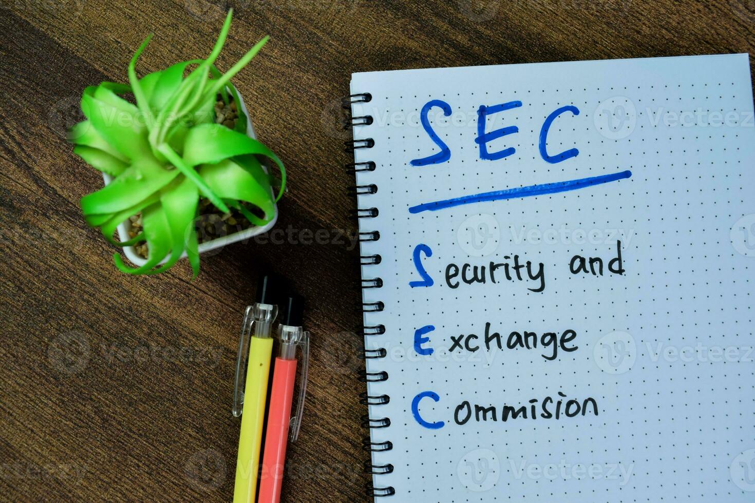 Concept of SEC - Security and Exchange Commision write on book isolated on Wooden Table. Pro Photo