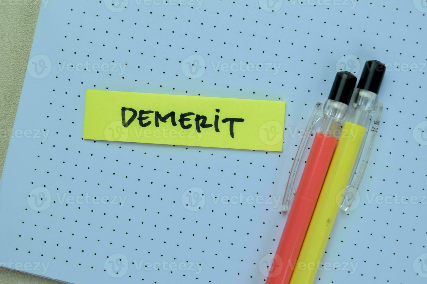 Concept of Demerit write on sticky notes isolated on Wooden Table. Pro Photo
