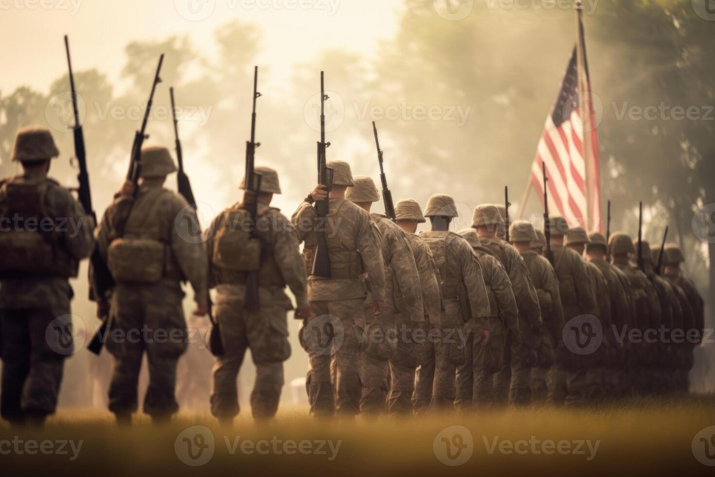 Men in military uniforms posing in front of an american flag. Pro Photo